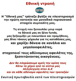 Η Εθνική τράπεζα απορρίπτει κάθε αίτημα αναβολής του πλειστηριασμού και υποβάλλει προτάσεις διακανονισμού που γνωρίζει καλά ότι αδυνατεί να ικανοποιήσει ο οφειλέτης την παρούσα στιγμή. Την στιγμή που δεκάδες χιλιάδες δάνεια τα εκποιεί σε ξένα funds έναντι πινακίου φακής, την ίδια στιγμή χιλιάδες καταθέτες της εισπράττουν τόκους ψίχουλα, οφειλέτες χρεώνονται με υπέρογκα πανωτόκια και έξοδα συναλλαγών (προμήθειες).