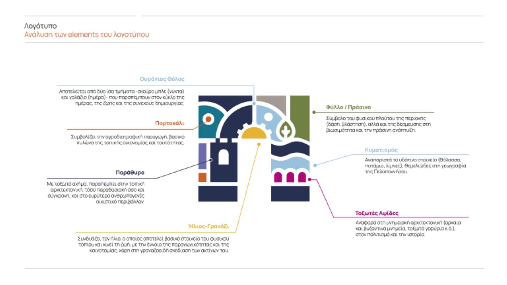 Το νέο λογότυπο, εμπνευσμένο από το γράμμα «Π», αποτελεί σύνθεση αφαιρετικών εικονιδίων που αντλούν έμπνευση από τη φύση, την ιστορία, την παραγωγική δραστηριότητα, την καινοτομία, τον πολιτισμό και το τοπίο της Πελοποννήσου. Μαζί με τη χρωματική παλέτα, τα εικαστικά μοτίβα και τις γραμματοσειρές συνθέτουν μια ενιαία οπτική ταυτότητα.