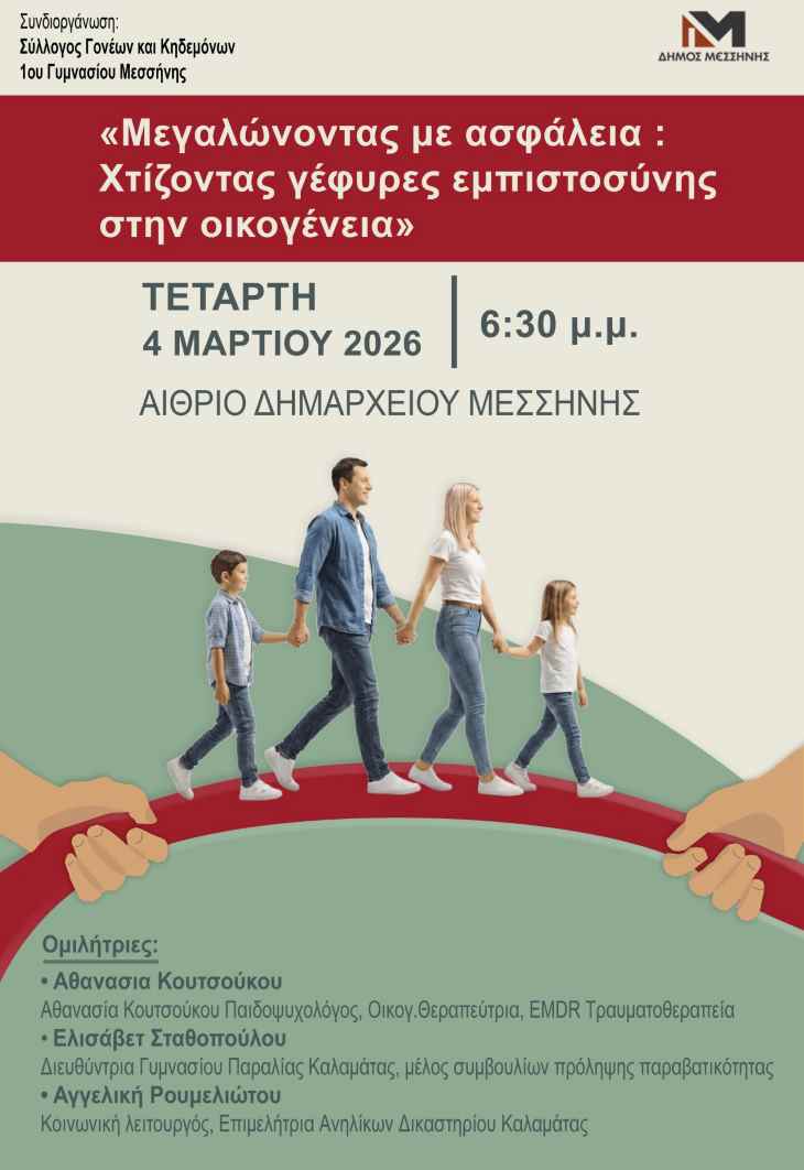 Εκδήλωση με θέμα «Μεγαλώνοντας με ασφάλεια: Χτίζοντας γέφυρες εμπιστοσύνης στην οικογένεια», πραγματοποιείται την Τετάρτη 4 Μαρτίου 2026 στις 6:30 μ.μ. στο αίθριο του Δημαρχείου Μεσσήνης με αφορμή την 6η Μαρτίου που έχει οριστεί ως Παγκόσμια Ημέρα κατά του σχολικού εκφοβισμού.