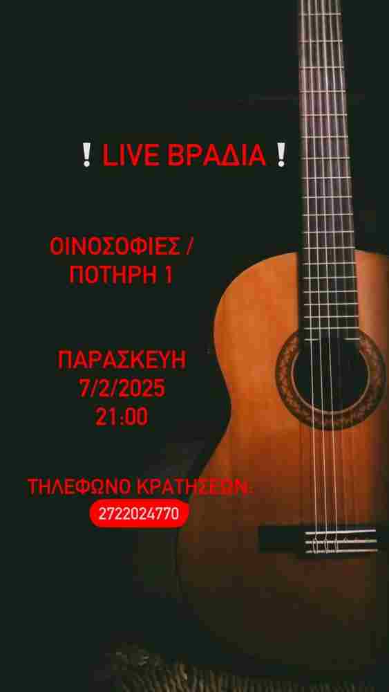 Κλείστε το τραπέζι σας έγκαιρα για να εξασφαλίσετε τη θέση σας σε αυτήν τη μαγευτική βραδιά. Η ταβέρνα Οινοσοφίες σας προσκαλεί να έρθετε και να απολαύσετε τη μαγεία της ζωντανής μουσικής, σε μια βραδιά γεμάτη κέφι, χαρά και μοναδικές στιγμές. Μην το χάσετε!