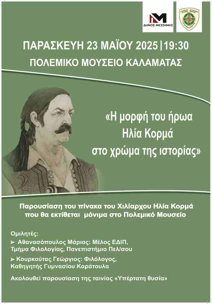 Η επίσημη παρουσίαση του πίνακα του Χιλίαρχου Ηλία Κορμά, που θα εκτίθεται πλέον στο Πολεμικό Μουσείο παράρτημα Καλαμάτας, θα γίνει την Παρασκευή 23 Μαΐου 2025 και ώρα 19:30 στο Πολεμικό Μουσείο Καλαμάτας.