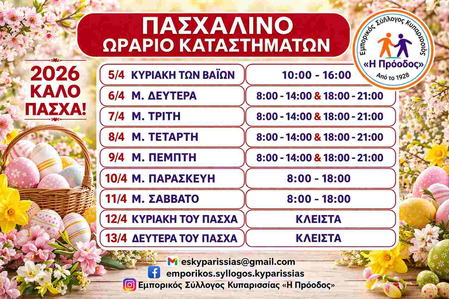 Με εορταστική διάθεση και ενόψει της Μεγάλης Εβδομάδας, ο Εμπορικός Κόσμος της Κυπαρισσίας ανακοινώνει το πασχαλινό ωράριο λειτουργίας των καταστημάτων για το 2026. Στόχος είναι η καλύτερη εξυπηρέτηση των καταναλωτών, αλλά και η ενίσχυση της τοπικής αγοράς, που αποτελεί βασικό πυλώνα της οικονομικής ζωής της πόλης.