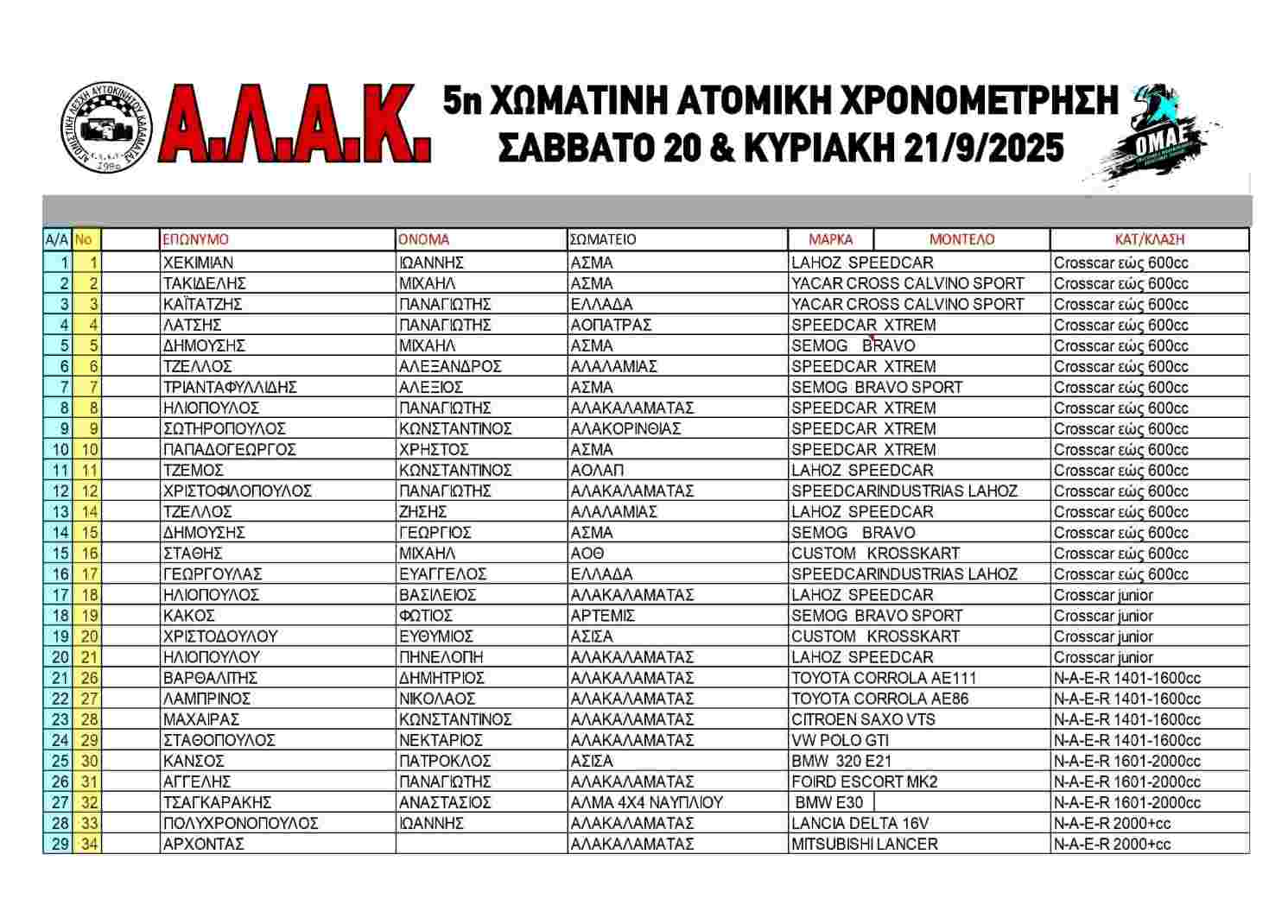 Ο Αγώνας αναμένεται να συγκεντρώσει 29 συμμετοχές, με τα 20 crosscar της κατηγορίας 600cc να υπόσχονται θεαματικές μάχες με το χρονόμετρο. Παράλληλα, τρεις αθλητές θα αγωνιστούν στην κατηγορία junior, ενώ οι οκτώ συμμετοχές στις κατηγορίες κυβισμού προσθέτουν ποικιλία και ανταγωνισμό στο πεδίο.