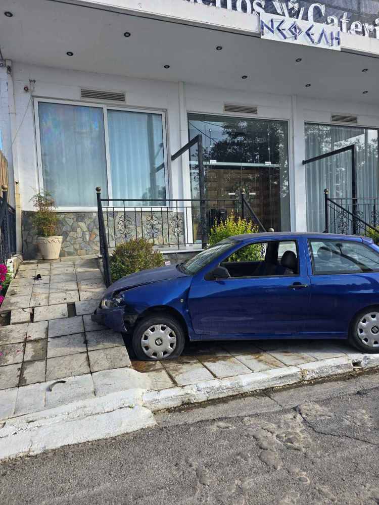 Η πρόσκρουση ήταν σφοδρή, προκαλώντας στο σταθμεύνο αυτοκινήτο και υλικές ζημιές στην είσοδο του καταστήματος